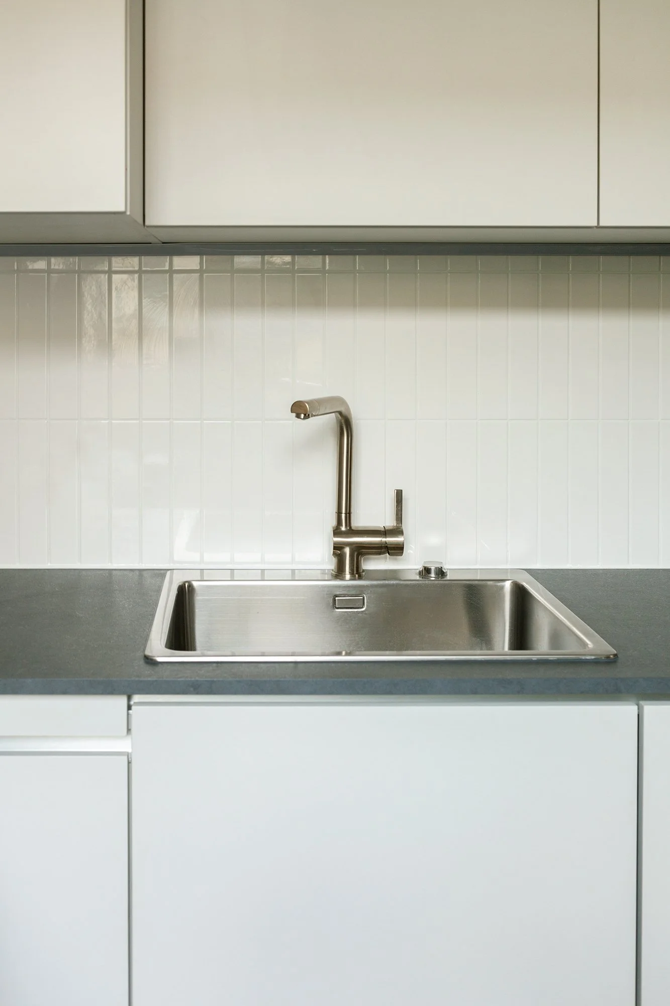 We made a tweak to the original design by opting for Spectre tiles from the renowned Italian brand 41zero42 for the backsplash. Additionally, the client chose to retain her existing ceiling light to align with budgetary considerations. The outcome is a sleek and minimalist kitchen that fulfills the client's request for ample storage space.