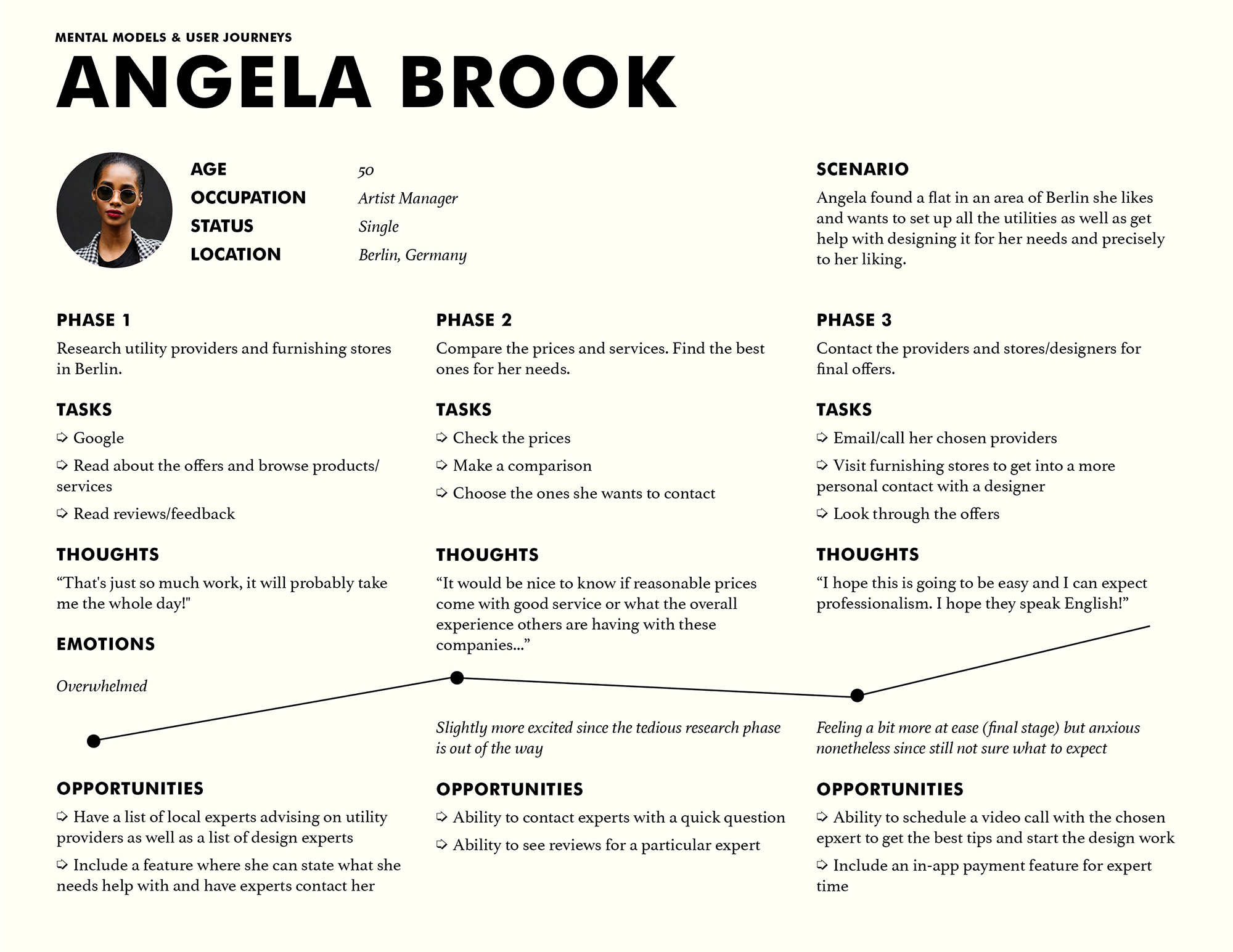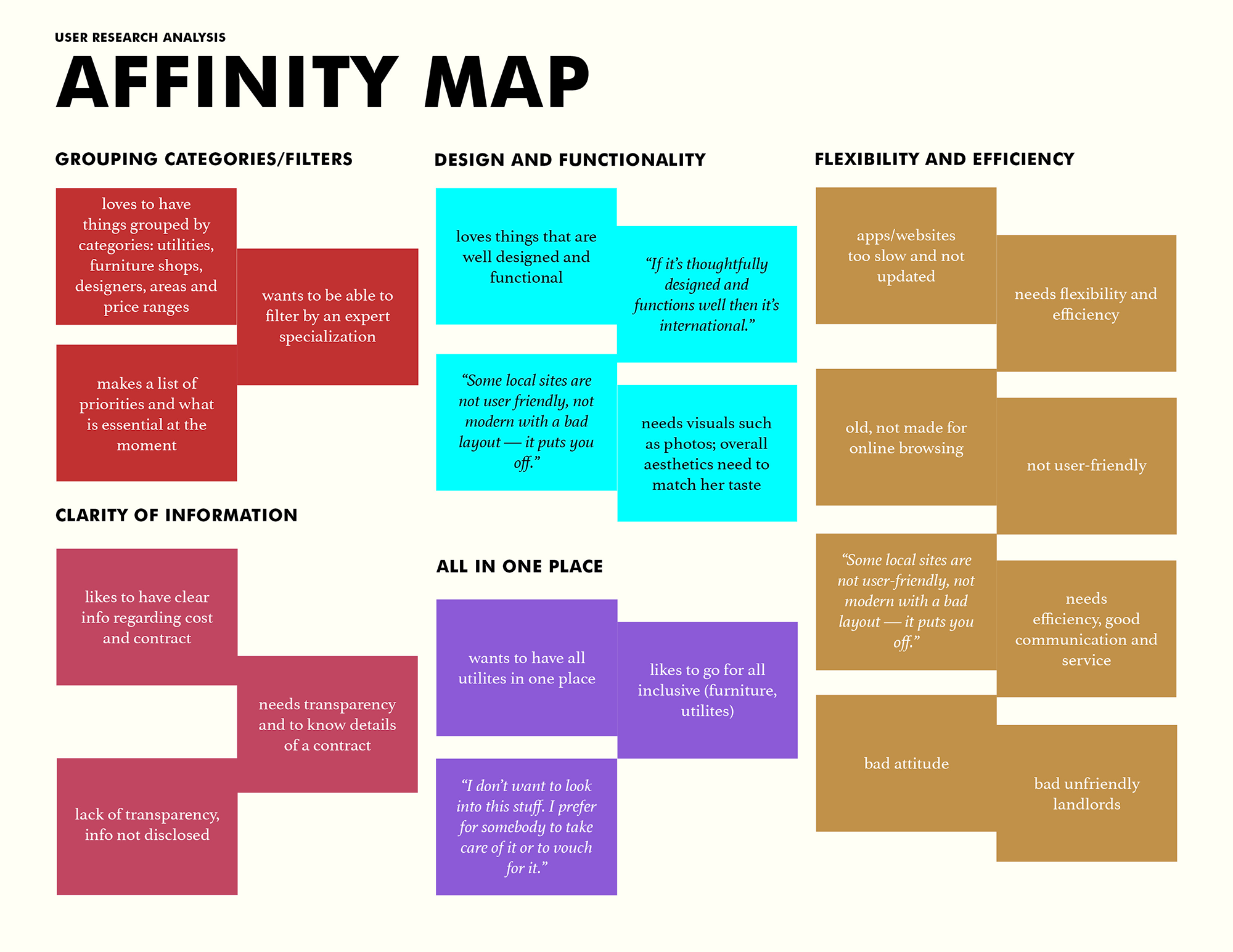 To gain valuable insights into my users' objectives and challenges, I conducted a comprehensive research process that integrated two key methodologies: user interviews and contextual inquiries. During this phase, I interviewed three individuals—Lamia, Cristina, and Katerina—who had recently undergone the process of finding a home and setting it up. Their firsthand experiences provided essential data to achieve the following research goals: