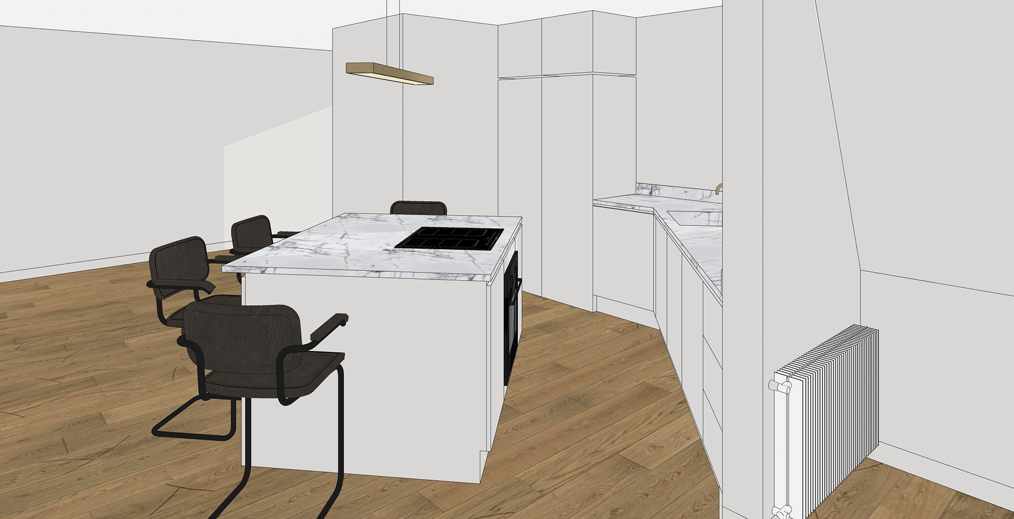 Most of the kitchen storage was strategically positioned along the bathroom/kitchen wall, with a few lower cabinets on the opposite side to balance the layout. Alternatively, a narrow breakfast bar could be considered to maintain the room's spacious feel and minimize clutter as seen in my drawings below.