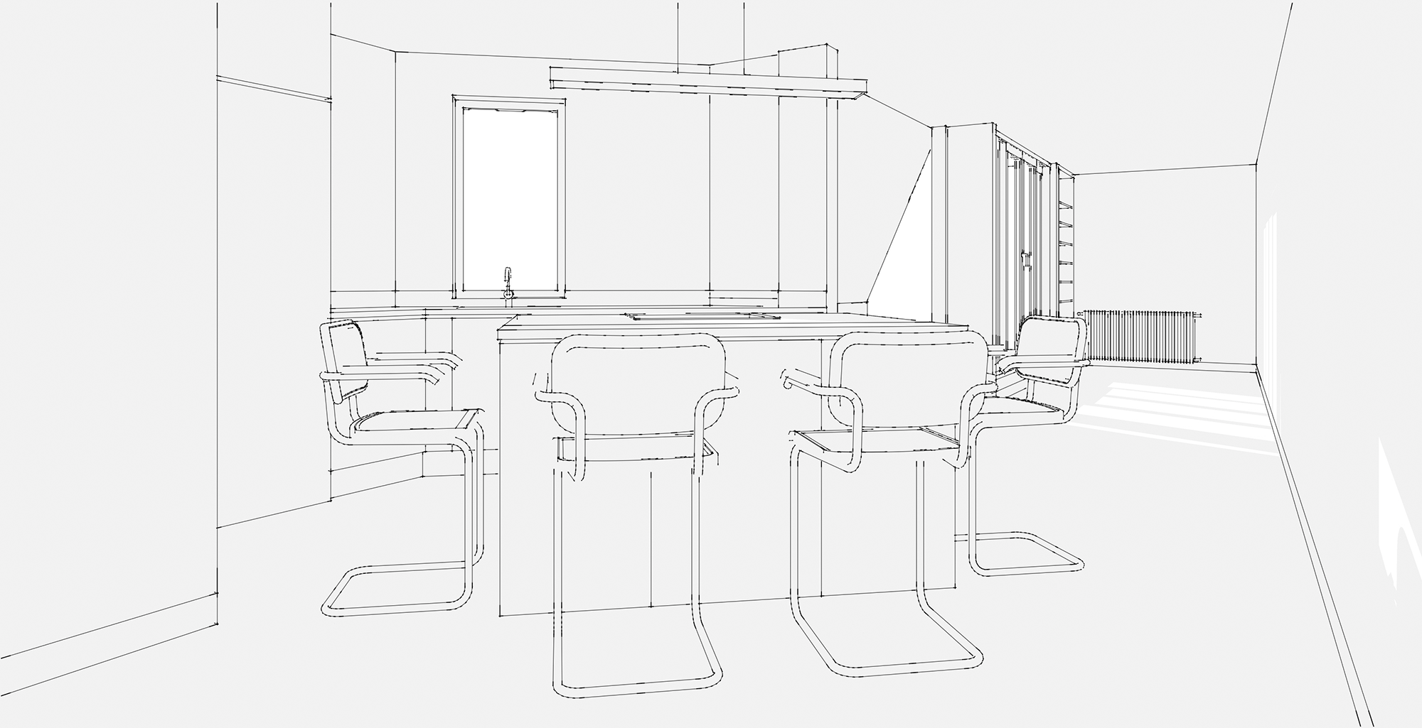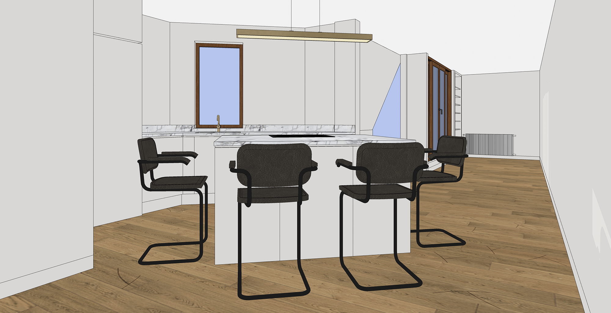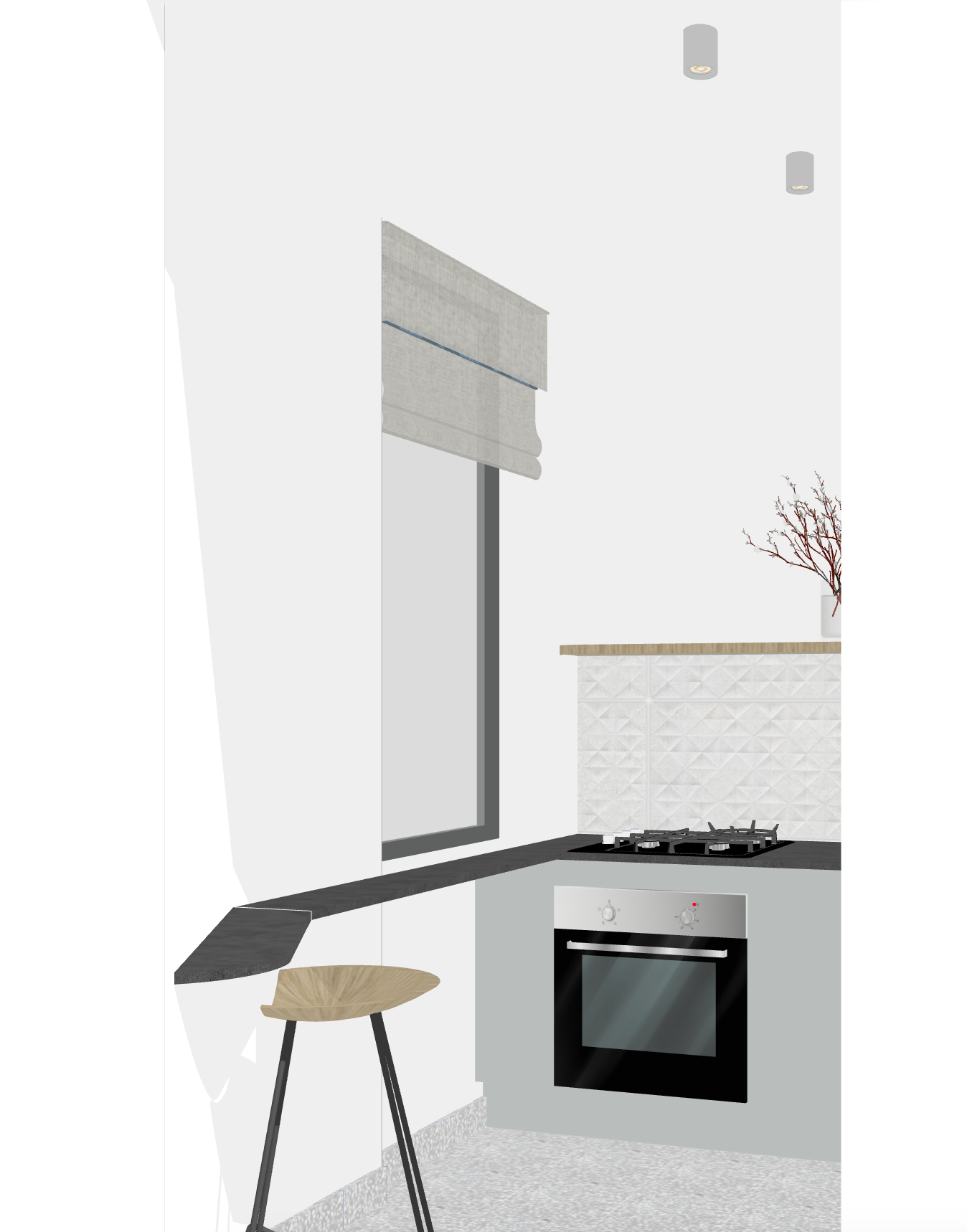 The kitchen was designed with two levels to seamlessly connect one of the walls with the window sill, creating a cohesive visual flow between the kitchen area along the front wall and the storage space on the adjacent left wall (or breakfast area as depicted in my drawing).