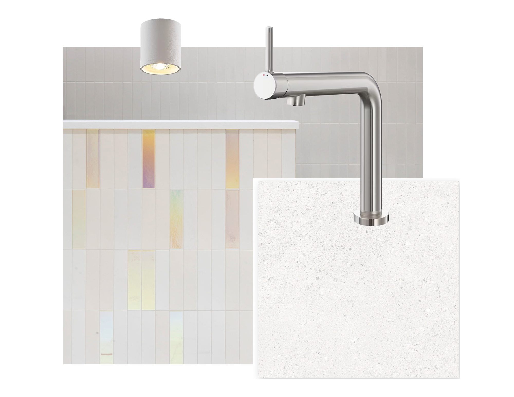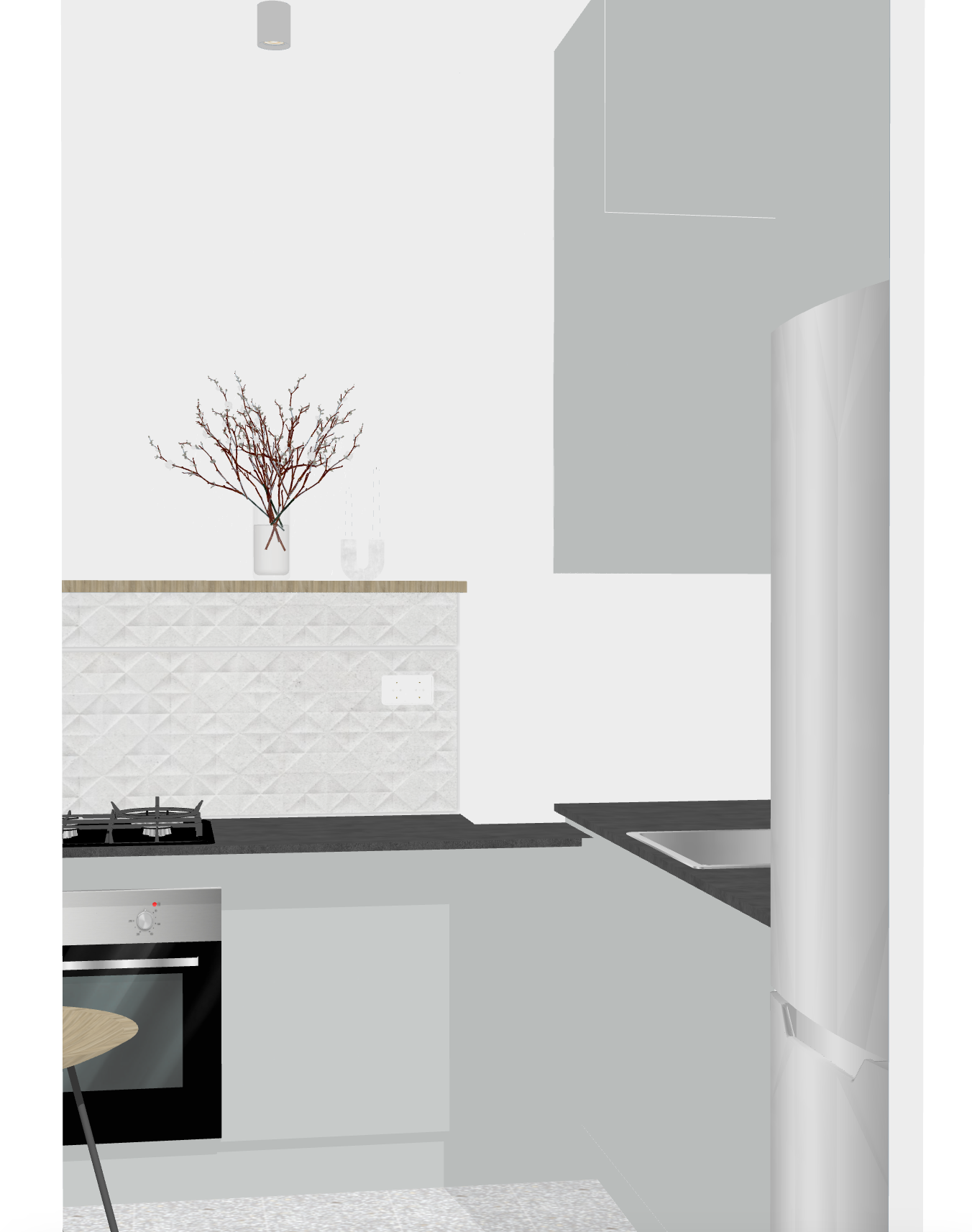 We made a tweak to the original design by opting for Spectre tiles from the renowned Italian brand 41zero42 for the backsplash. Additionally, the client chose to retain her existing ceiling light to align with budgetary considerations. The outcome is a sleek and minimalist kitchen that fulfills the client's request for ample storage space.